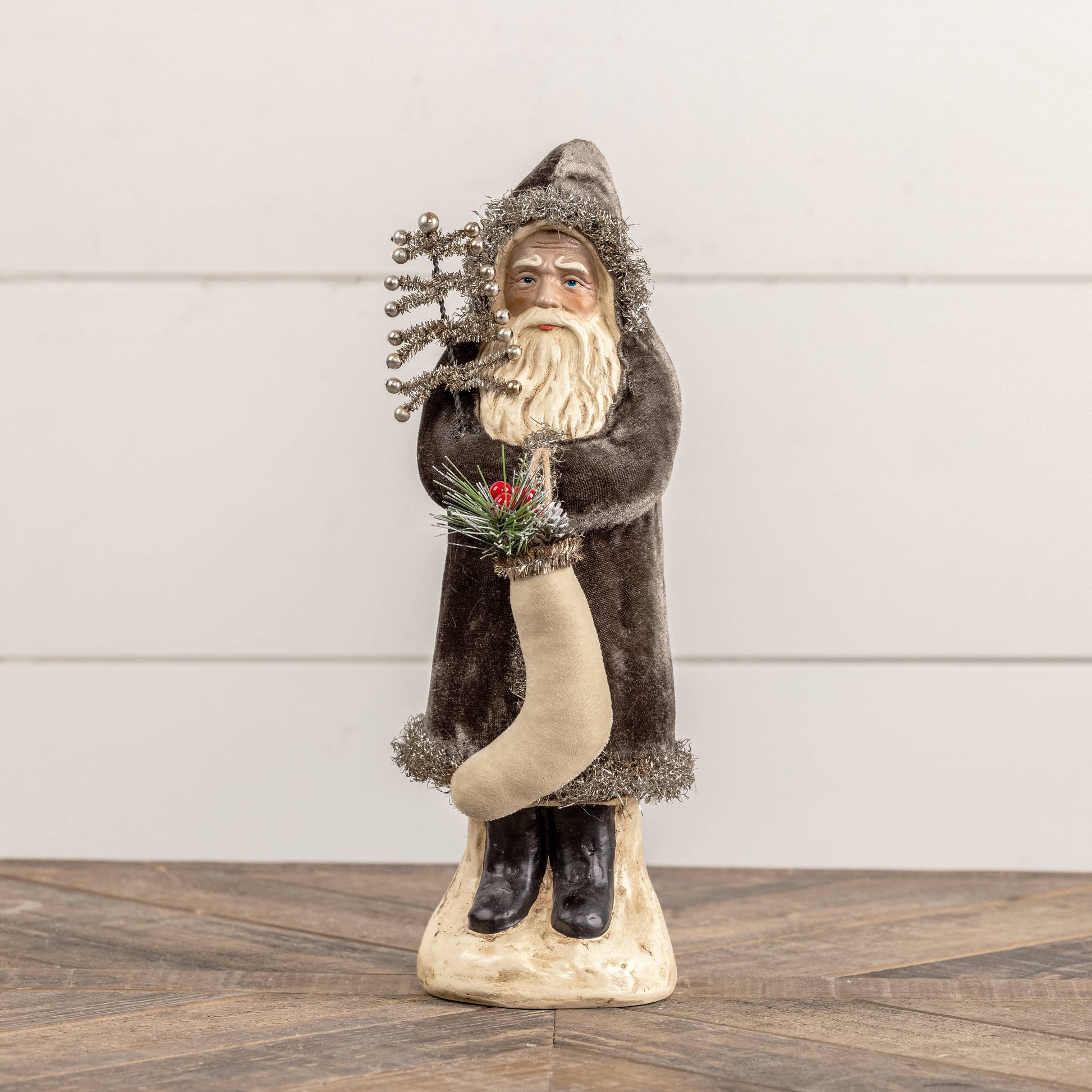 The 12" Charcoal Velvet Belsnickel features a timeless vintage Santa design clad in soft charcoal velvet, making it an elegant addition to any holiday décor collection.